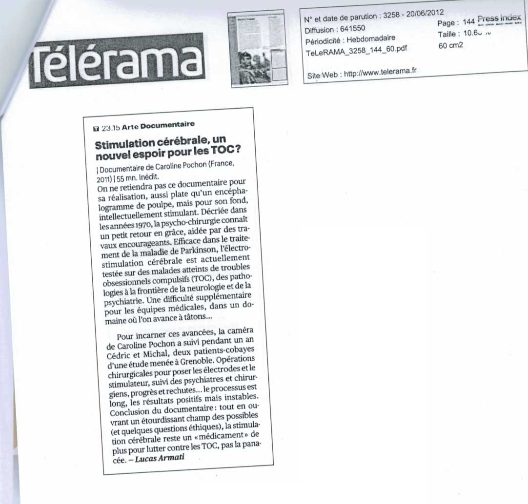 Télérama – Stimulation cérébrale, un nouvel espoir pour les TOC